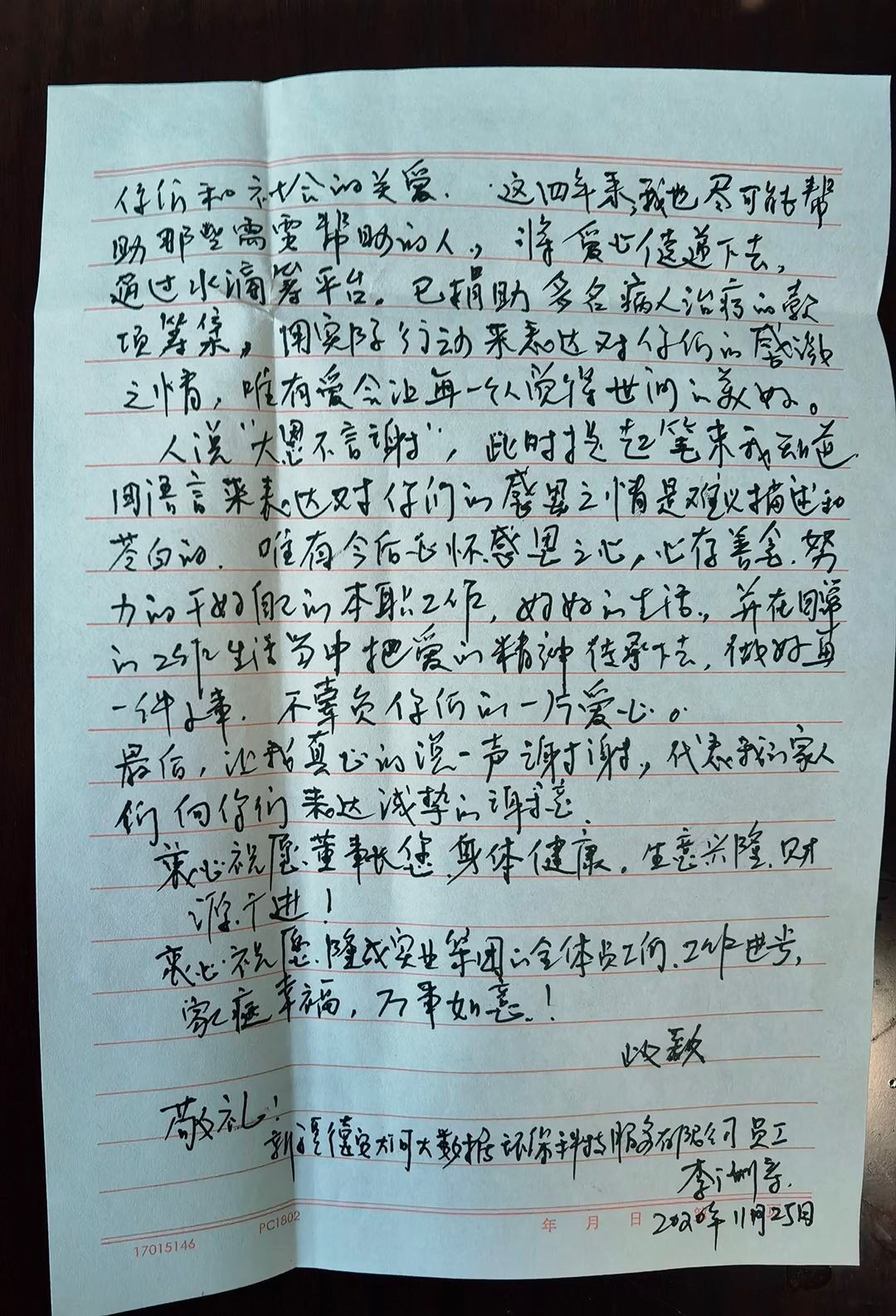 2020年11月27日,集團(tuán)公司接到一位來自“金雪馳愛心基金”幫扶者(新疆德安大河大數(shù)據(jù)環(huán)保科技服務(wù)有限公司員工)李先生的登門答謝。