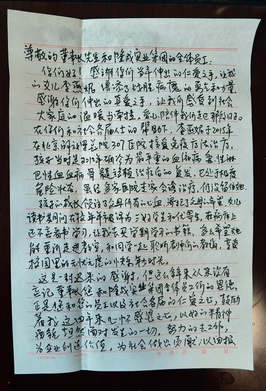 事由:金雪馳愛心基金于2012年援助了李先生,李先生女兒在2012年被確診為白血病,曾接受骨髓移植后又復(fù)發(fā),2015年在北京解放軍總院接受治療時(shí)已處于極度危險(xiǎn)狀態(tài),隨后經(jīng)過多家醫(yī)院的專家會(huì)診治療,最終還是沒能將孩子的生命挽救回來,當(dāng)年在求醫(yī)路上接受到“金雪馳愛心基金”的捐助,一直對(duì)董事長(zhǎng)劉輝先生和隆成實(shí)業(yè)的全體員工存有感恩之心,今日登門拜訪,并送上感謝信和答謝禮。董事長(zhǎng)親切的接待了李先生也回贈(zèng)于他金雪馳紀(jì)念品,董事長(zhǎng)對(duì)李先生女兒的遭遇表示不幸,并表示了隆成集團(tuán)對(duì)他的幫助是我們做企業(yè)人的社會(huì)責(zé)任,也希望“金雪馳愛心基金”今后能夠幫助到更多的人和事。